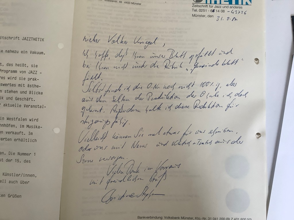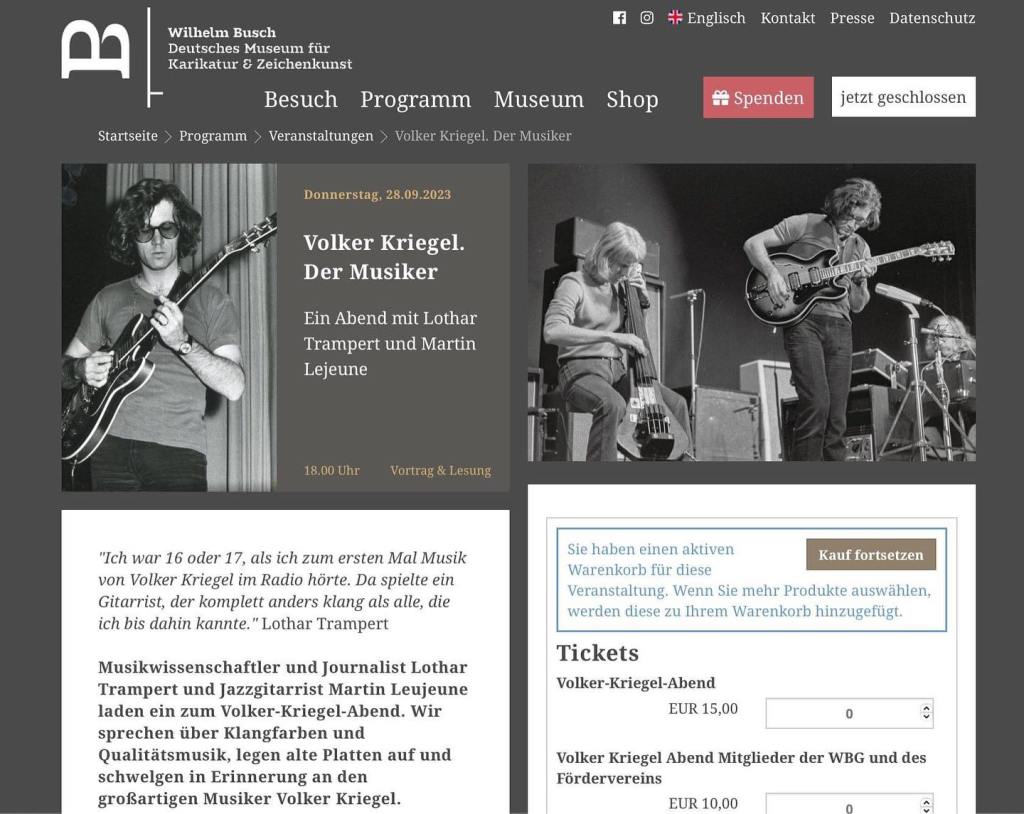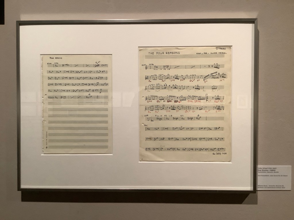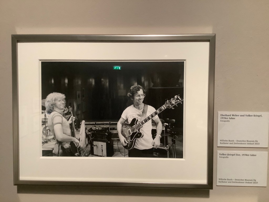 Am Donnerstag, 28.09.2023 haben der Frankfurter Jazz-&-more-Gitarrist Martin Lejeune und ich, gemeinsam mit Luise Wick vom Wilhelm Busch Museum, einen Abend über die Musik von Volker Kriegel gestaltet. Wir haben bekannte und unbekannte Aufnahmen von 1963 bis 1987 präsentiert, über Volker Kriegels Kunst als Gitarrist und Grafiker gesprochen, über seine Wurzeln und Einflüsse aus musikwissenschaftlicher und musikalischer Sicht. Danke an Martin für die vielen tollen Einspieler und Erklärungen zu Volker Kriegels Gitarrenspiel und an Luise für die perfekte Organisation. Hat Spaß gemacht!