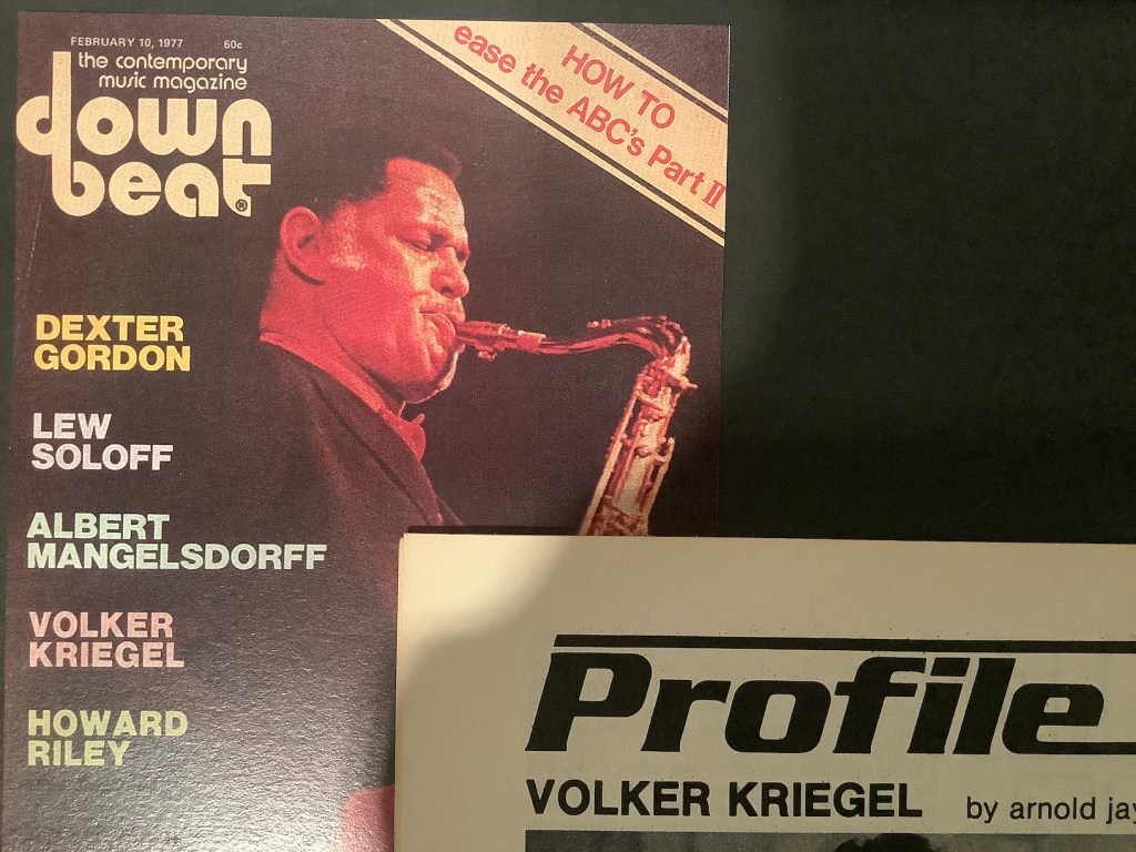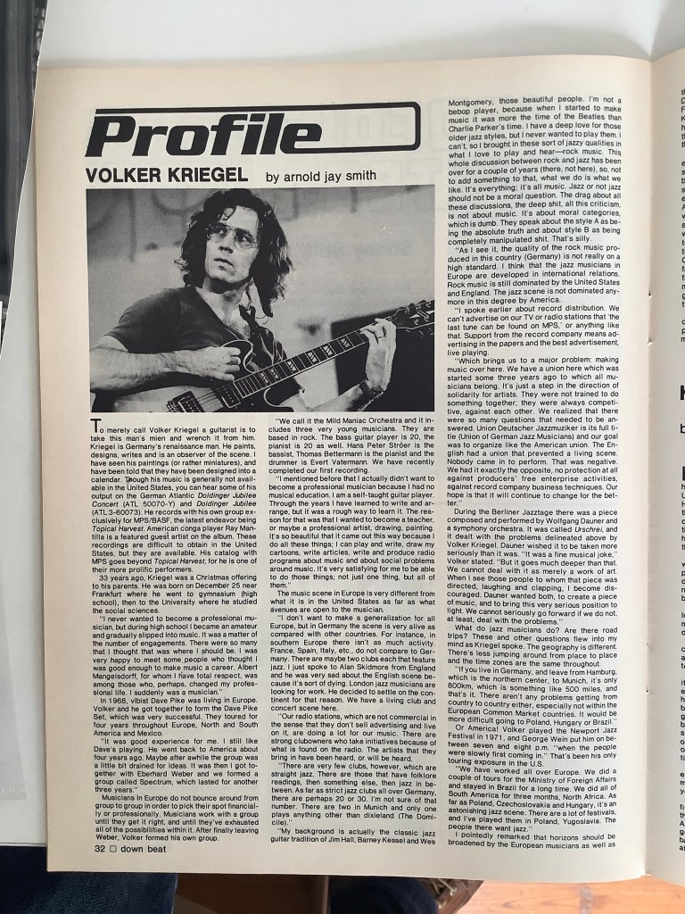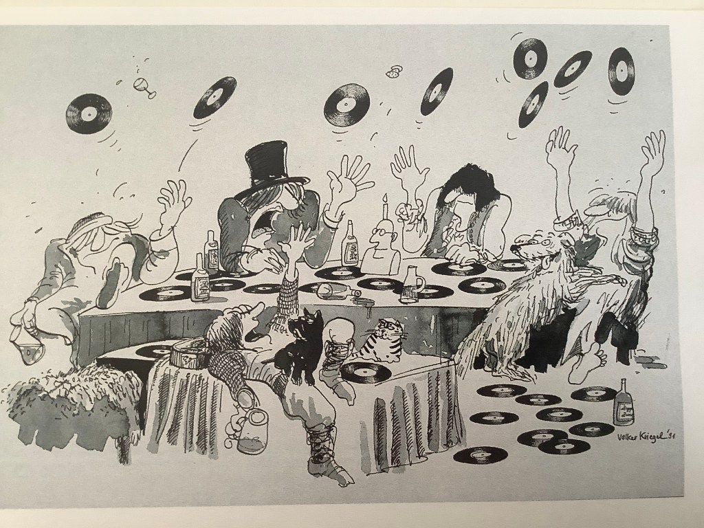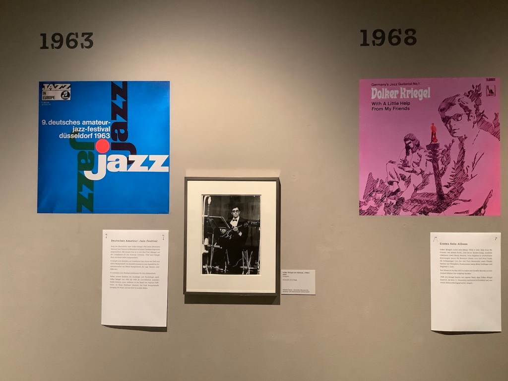 Zur Ausstellung ist ein schönes Begleitbuch erschienen: Es geht um das Multitalent Volker Kriegel, der neben seinem Job als Jazz-Gitarrist auch als Autor, Label-Gründer, Radio-Moderator, Mitbesitzer des legendären Frankfurter Guitar Center von Peter Coura und Karikaturist tätig war. Zu letzterem Fachgebiet hat der Kölner Illustrator Nikolaus Heidelbach einen sehr unterhaltsamen Text zu JA, WAS DENN?! beigesteuert, in meinem Artikel „Über Klangfarben und Qualitätsmusik“ geht es um den Musiker Volker Kriegel.
