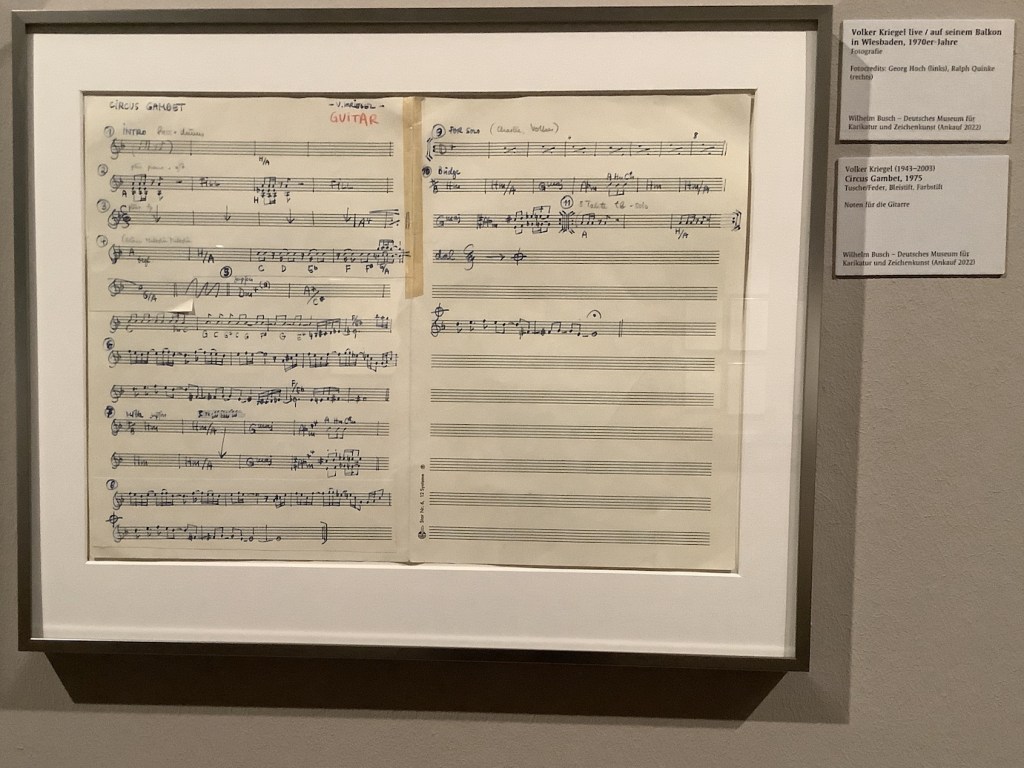 Vom 07.07. bis zum 31.10.2023 fand im „Wilhelm Busch – Deutsches Museum für Karikatur und Zeichenkunst“ in Hannover eine Ausstellung statt, die Einblick in das Multitalent Volker Kriegel gab, in seine Biografie, in sein Wirken als Jazz-Gitarrist sowie als Autor und Illustrator. Karikaturen, Selbstporträts, Skizzenbücher, Noten, Manuskripte, Fotos, Briefe und Künstlerkorrespondenz waren hier zu sehen.